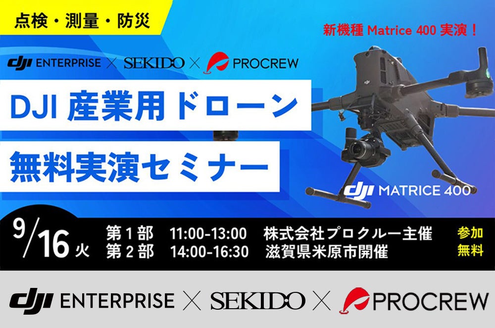 DJI(ディージェイアイ)正規販売代理店としてドローンビジネスの最先端を支える株式会社セキド(本社:東京都港区、代表取締役:大下貴之)は、株式会社プロクルー(本社:滋賀県長浜市、代表取締役:酒井正裕)と共催し、2025年9月16日(火)に滋賀県米原市で「産業用ドローン 点検/防災/ICT施工/測量 無料実演セミナー」を開催いたします。本セミナーでは、高所点検・防災・ICT施工・測量などの現場業務におけるAI技術を搭載した最新ドローンの導入効果を、実機デモフライトや取得データの具体的な解説を通じてご紹介します。