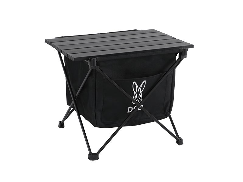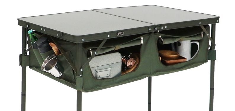 テーブル下に収納スペースを備えた折り畳み式アウトドアテーブル。車内収納の際は棚としても利用可能、天板の高さを44~80.5cmまでの4段階に調節可能。