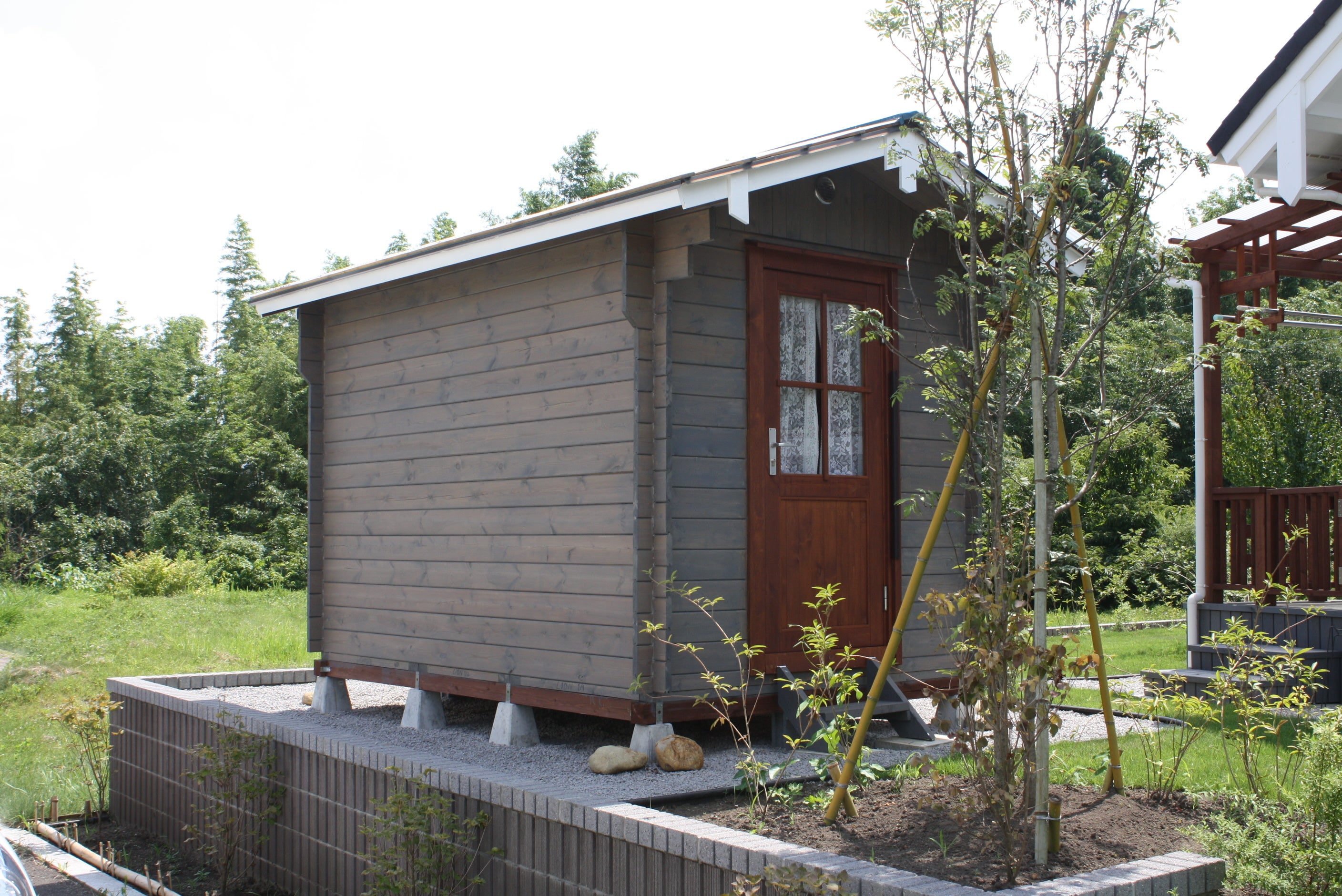 初心者でも組み立てが可能な平屋のミニログハウス。テレワーク用の離れとして、また、子どもの遊び場や、趣味用の小部屋として。実物展示をご覧いただけます。