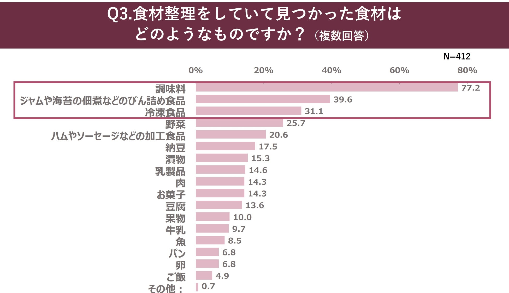 さらに「掃除をしていて見つかった食材(冷蔵庫や冷凍庫に残りがちな食材)はどのようなものですか?」という質問に対し、最も多かったのは「調味料」で77.2%、次いで「ジャムや海苔の佃煮などのびん詰め食品」が39.6%、「冷凍食品」が31.1%という結果となりました。細々とした調味料は、知らず知らずのうちに奥に入って使うのを忘れてしまうなど、こまめに食材整理をしないと残らせてしまうことがうかがえます。