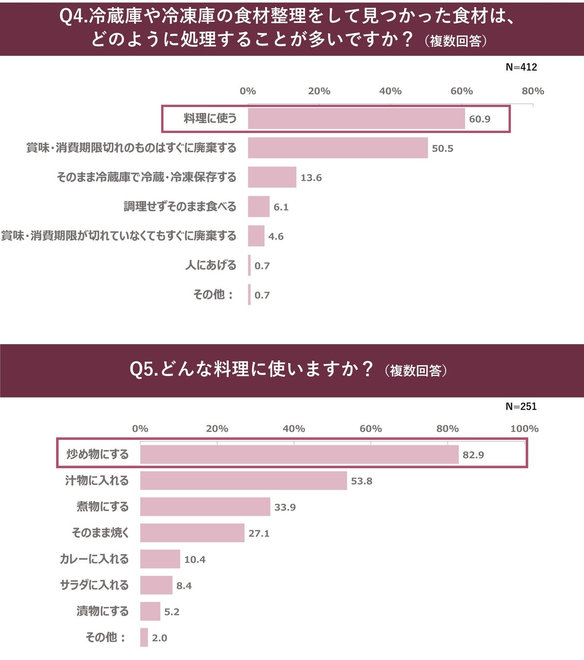 また「冷蔵庫や冷凍庫の掃除をして見つかった食材は、どのように処理することが多いですか?」と聞いたところ、「料理に使う」と回答した人は60.9%となり、そのうち「どんな料理に使いますか?」と聞いたところ、「炒め物にする」が最多の82.9%となり、次いで「汁物に入れる」(53.8%)、「煮物にする」(33.9%)という結果に。特に発見されがちなものは「調味料」であったことから、味付けがしやすく手軽に調理できる炒め物レシピが人気なのかもしれません。