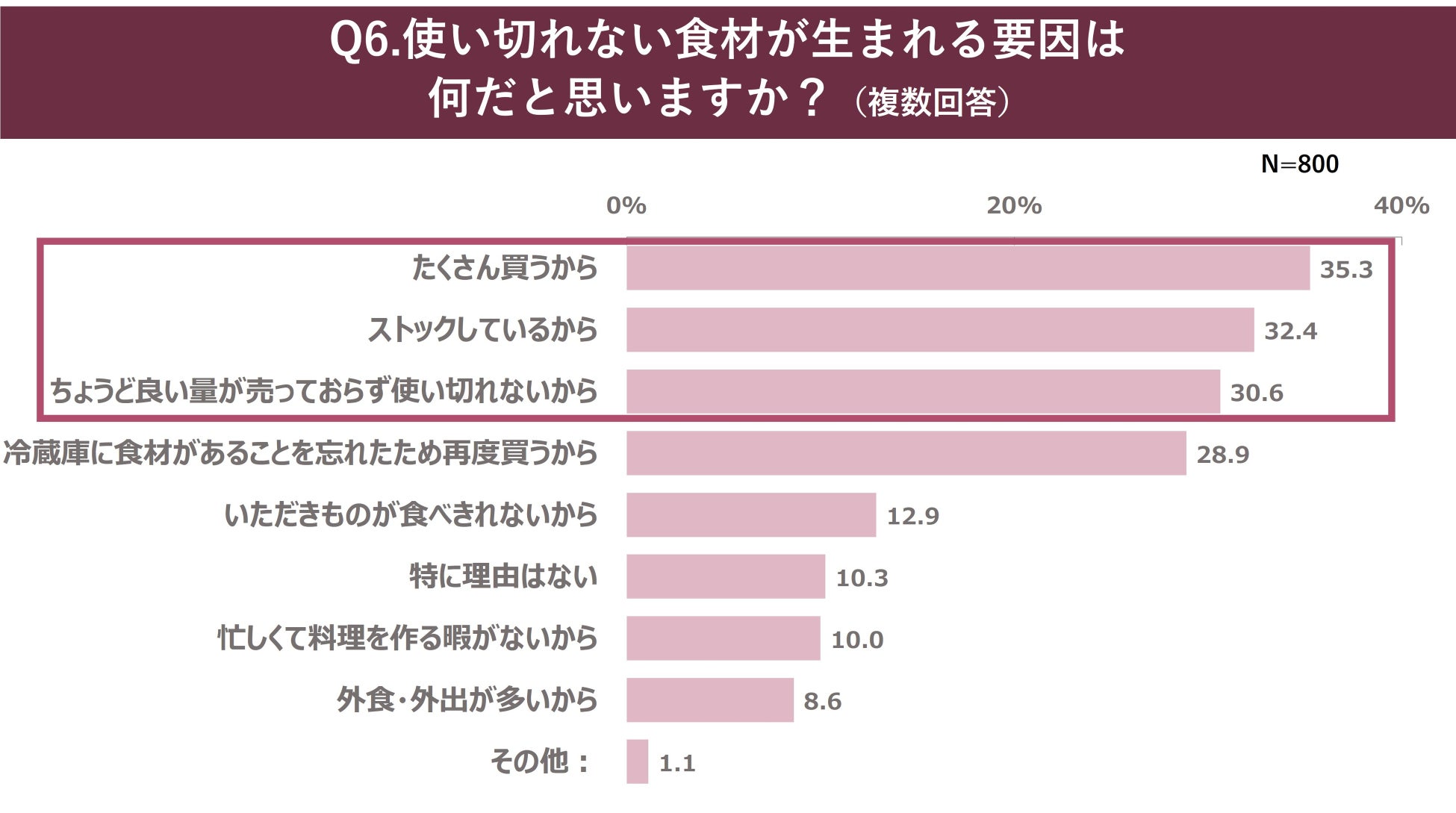 《使い切れない食材が生まれる理由は「たくさん買うから」「ストックしているから」「ちょうど良い量が売っておらず使い切れないから」「冷蔵庫に食材があることを忘れた(冷蔵庫で見つからない)ため再度買うから」がそれぞれ約3割の結果に。》