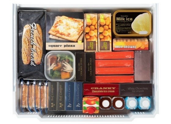市販の冷凍食品やホームフリージング食品など形状がバラバラなものを上段、下段のサイズに合わせて収納しましょう。また冷蔵室と違い、きっちりと詰める方が冷凍効率が上がります。