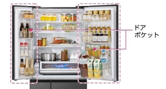 例えばフレンチドアのドアポケットの場合なら、右のドアポケットにはいつも使う調味料や缶入り飲料を入れるようにしておくと、必要な時に右扉だけ開けて使うといったこともできます。
