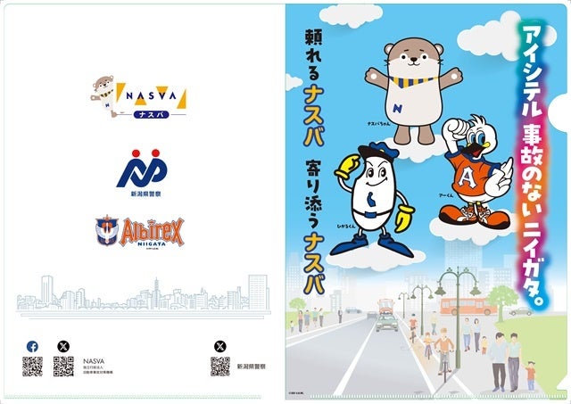 ナスバのオリジナルキャラクター「ナスバちゃん」と新潟県警察本部のマスコット「ひかるくん」、アーくんがコラボした限定クリアファイルを作成しました。ブースにお越しいただいた方にプレゼント!