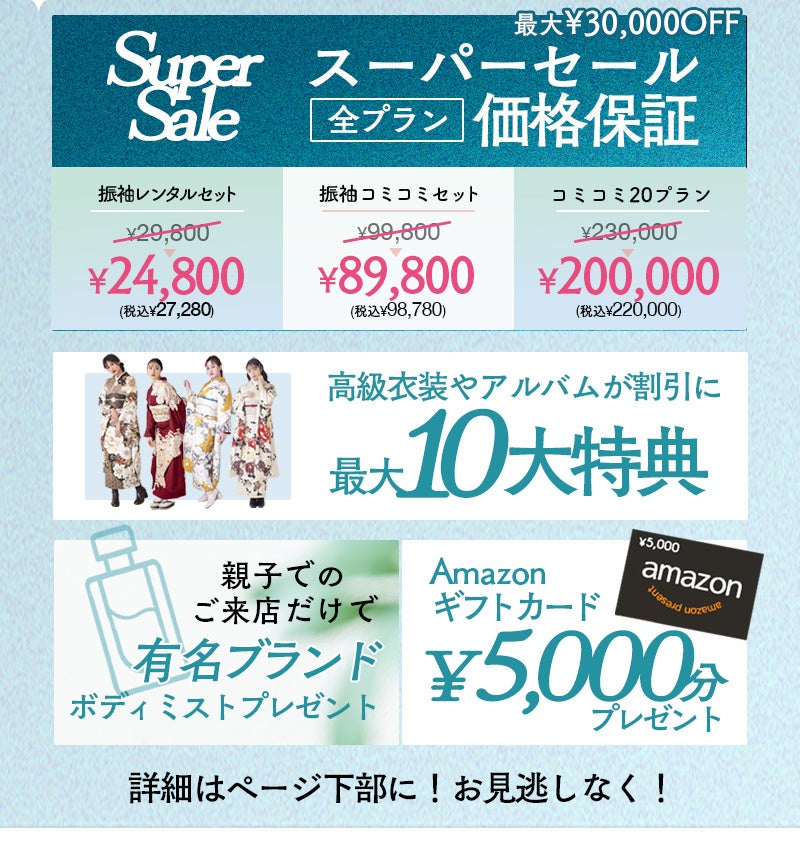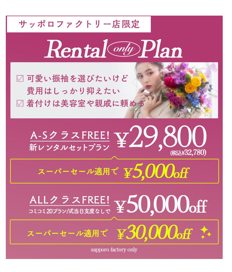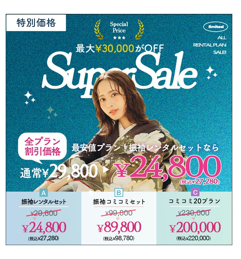 スーパーセールで全てのプランが割引に。最安プランの振袖レンタルセットは¥24,800+税からご案内が可能。