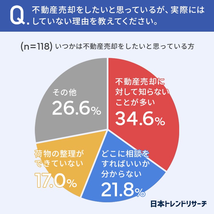 「どこに相談すればいいか分からない」と合わせて、56.4%の人が「わからない」という理由で売却に踏み切れない回答となりました。