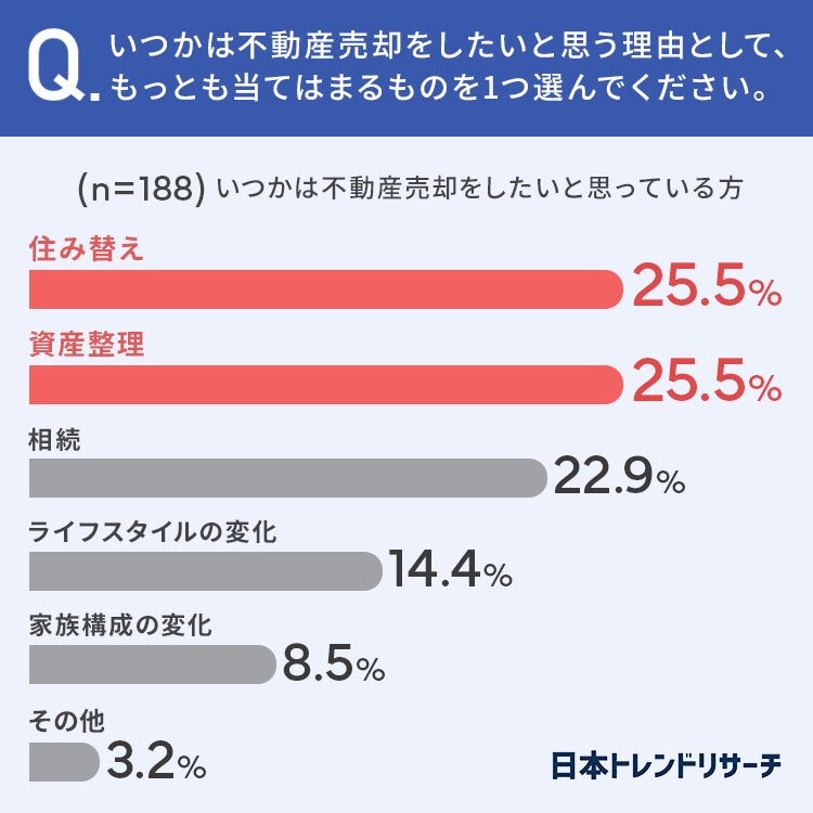 「住み替え」と「資産整理」が25.5%と同値で、続いて「相続」が3番目の22.9%という結果となりました。