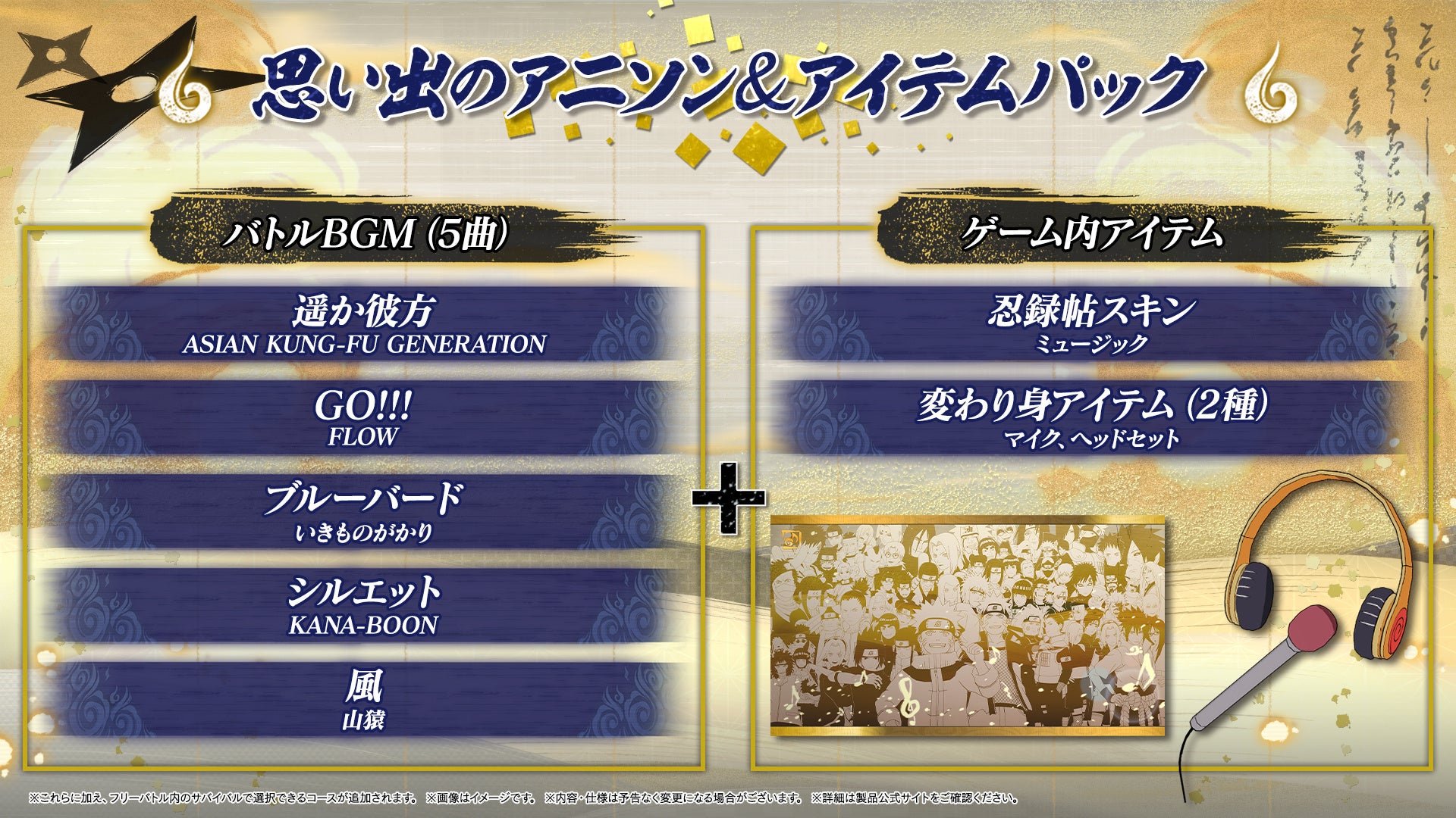 バトル中のBGMをアニメ「NARUTO-ナルト-」「NARUTO-ナルト- 疾風伝」の主題歌に変更できる他、ゲーム内アイテムなどが収録されているパックです。