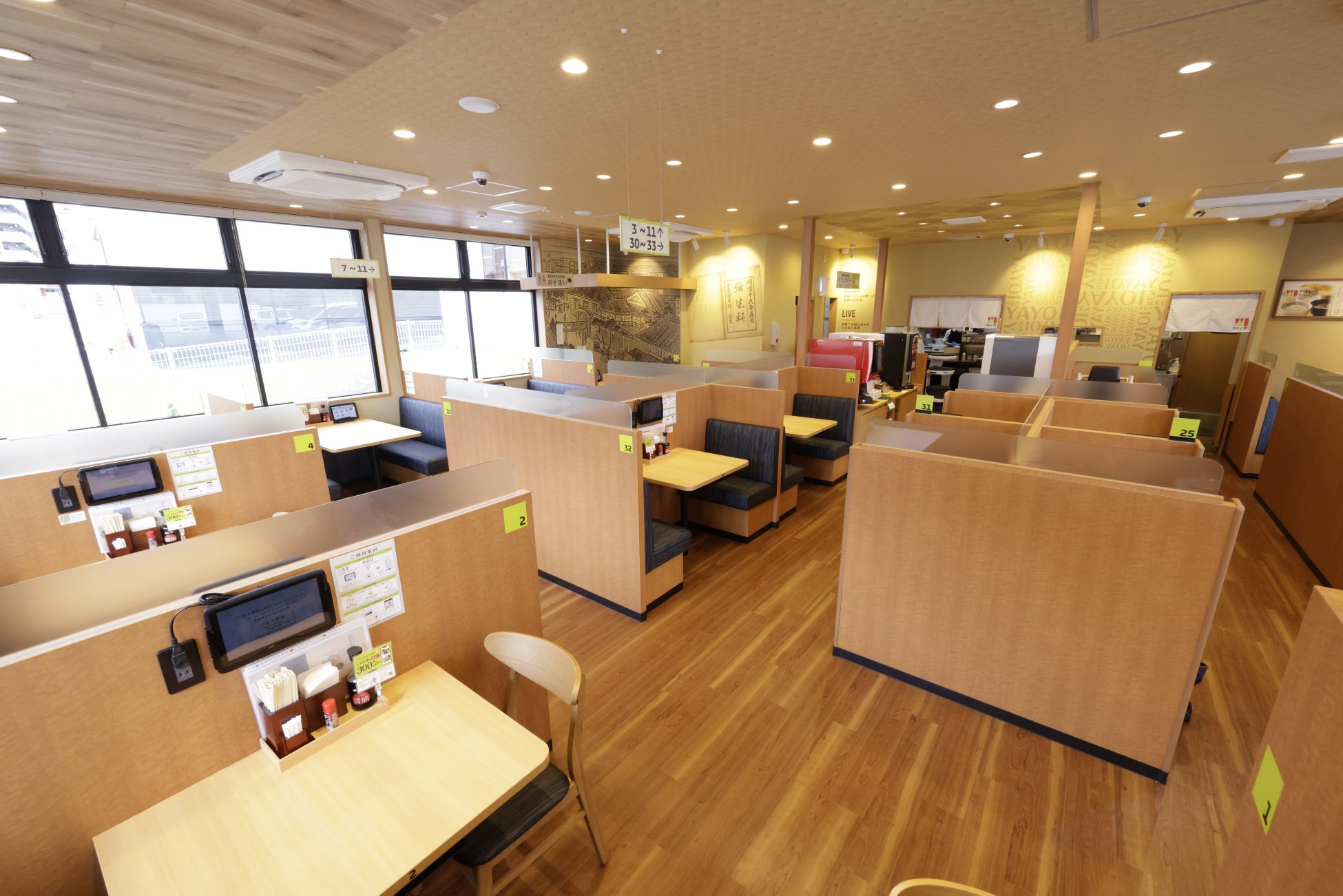当店舗は2023年12月に公開しました新ロゴ・シンボルマークなど新しいブランドイメージを表現した店舗となっております。新ロゴ看板、モダンな“和”をイメージさせる暖簾(のれん)や「やよい軒」の名前のルーツでもある“彌生軒(やよい軒)”の歴史的資料をモチーフとした壁紙など、新ブランドステートメントを表現する“上質な”イメージでデザインされた店舗です。また、新しい取り組みとして、ゆっくりとメニューを選んでいただけるようテーブルに設置したタブレット端末からのオーダーや店舗限定デザートメニューの導入、さらにドリンクバーを設置することでくつろぎの時間を過ごしていただけるようにしました。 もちろん、“ごはん”や“だし”、“漬け物”のおかわり自由が楽しめる『おかわり処』もございます。