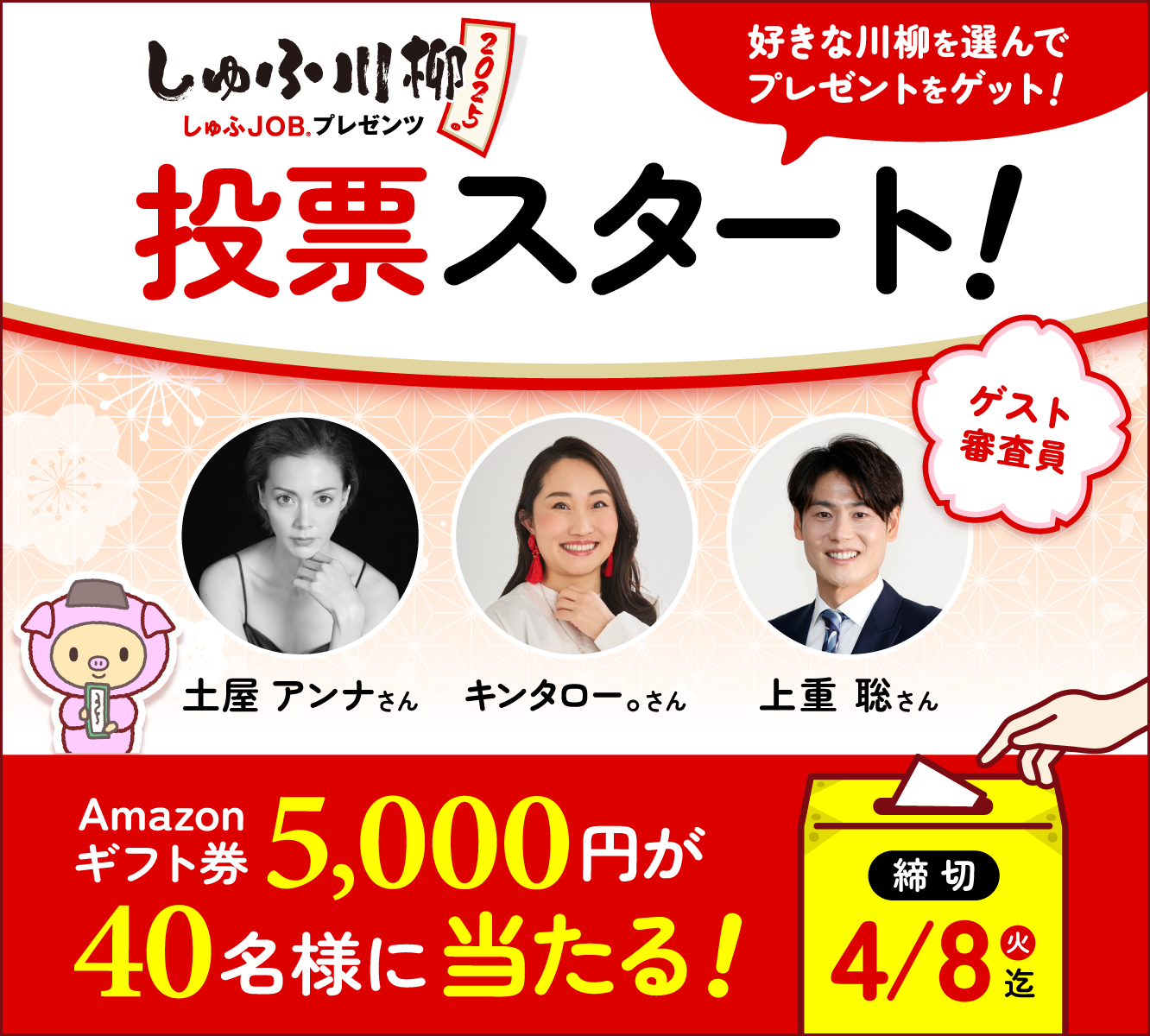 ビースタイルグループで求人サイト『しゅふJOB』を運営する株式会社ビースタイルメディア(本社:東京都新宿区、代表取締役社長:石橋聖文)は、「しゅふJOBプレゼンツ しゅふ川柳」に応募のあった4,525句から選出したノミネート作品45句を発表いたします。また、一般投票を3月14日(金)~4月8日(火)の期間で受け付けております。みなさまからの投票が入賞作品を左右しますので、ぜひふるってご参加ください。