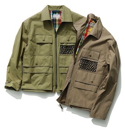 その名の通り釣り用にデザインされたアウターは、ショート丈で前身頃にはフラップの付いた大きめのポケットを多数備え、可能な限り手荷物を少なくできるよう設計されています。写真左のカーキカラーはきれいめなコットンツイル生地、右のベージュカラーは丈夫な馬布に塩縮ワッシャー加工を施した生地で、細かいシワ感がビンテージ感を演出しています。裏地には、2022 年春夏で展開する「マドラスチェックシャツ」 の生地を採用。遊び心のエッセンスを取り入れています 。