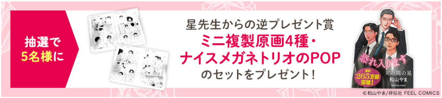 さらに、期間中に対象商品を税込400円以上購入で「星先生からの逆プレゼント賞」に応募することができ、抽選で5名様にミニ複製原画4種セット&ナイスメガネトリオの店頭用POP(いずれも非売品)が当たるキャンペーンも実施します。