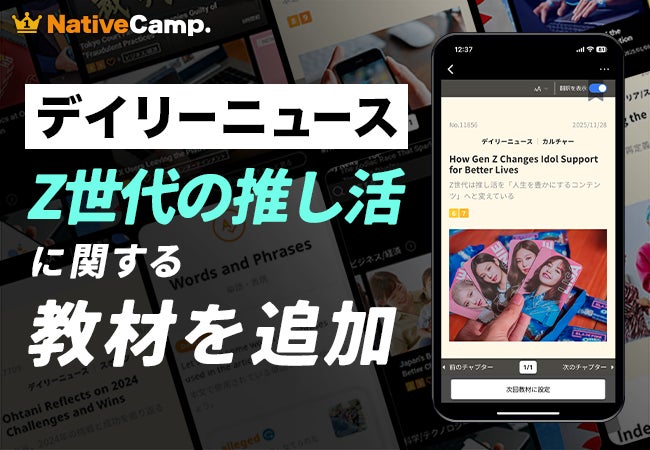 ネイティブスピーカーと回数無制限のオンライン英会話サービス「ネイティブキャンプ英会話」を展開する株式会社ネイティブキャンプ(東京都渋谷区 代表取締役:谷川国洋)は、人気教材「デイリーニュース」に、「Z世代の推し活」に関する教材を新たに追加したことをお知らせいたします。