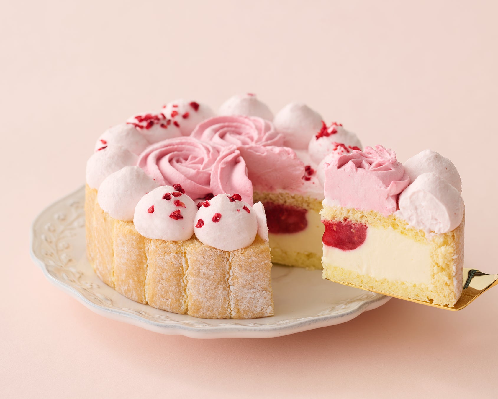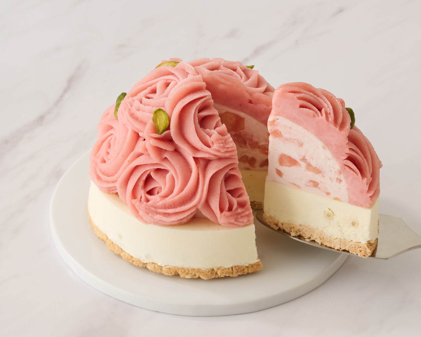 まろやかで優しい甘みのクリームチーズムースに甘酸っぱい苺とフランボワーズの果肉入りソースを入れて、ビスキュイ生地でふんわりと包みました。天面には、苺と桃をあわせた香り豊かな甘みのあるペッシュフレーズクリームを土台に、甘酸っぱいフランボワーズクリームをバラのように見立てて、華やかな花束をイメージしながら感謝の想いを込めて絞りました。