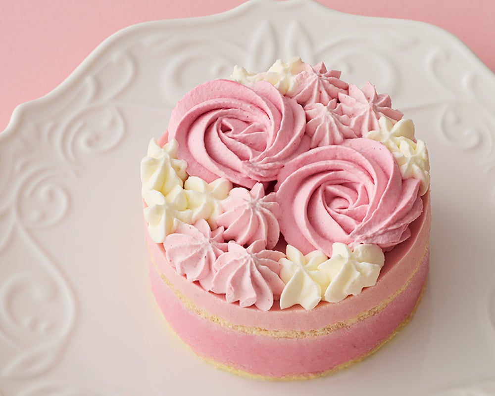 フランボワーズの甘酸っぱさと苺の爽やかな甘さ、ミルキーな味わいがとけあうムースケーキ。 ムースの中には、ごろっとした 苺をしのばせました。3種のクリームで天面に絞った華やかなブーケもポイント。愛らしいサイズのお花のケーキです。