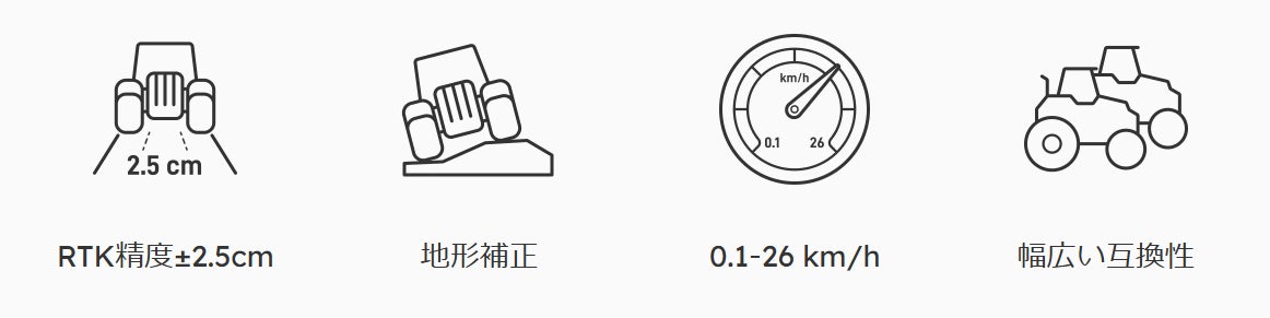 通常販売価格は税込77万円(※別途取付け費用)で、機種やメーカーを問わず様々な農機に後付けでき、初心者の方でも導入しやすく使いやすいスマート設計がコンセプトの自動操舵システムです。別途オプションにて地域のニーズを満たすターン機能やISOBUS規格の施肥機やスプレーヤなどの各種作業機と連携や制御も可能になります。