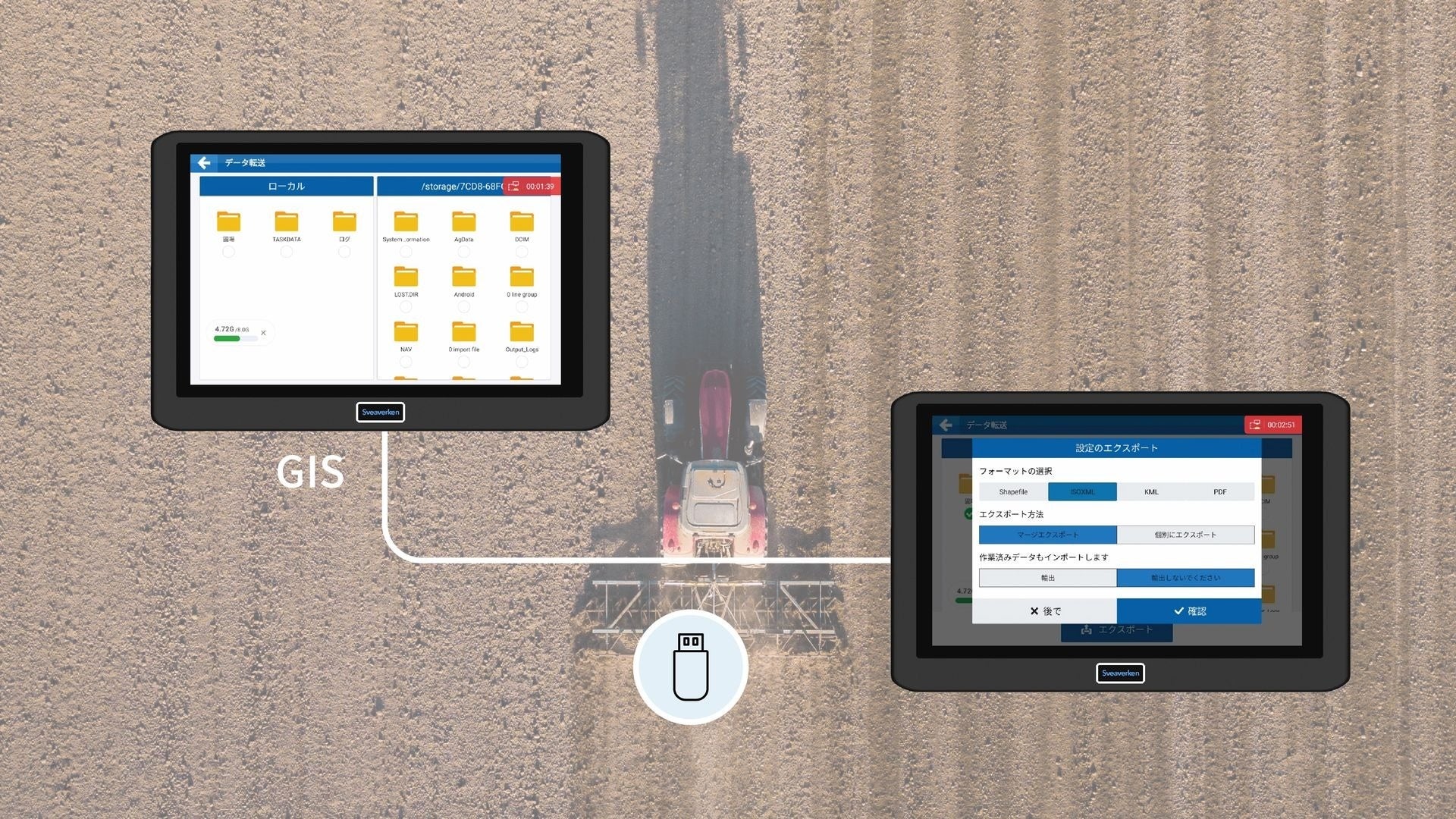 USBを使用して、標準的なフォーマットで機械間の圃場情報を転送したり、時間の節約と効率化が図れます。