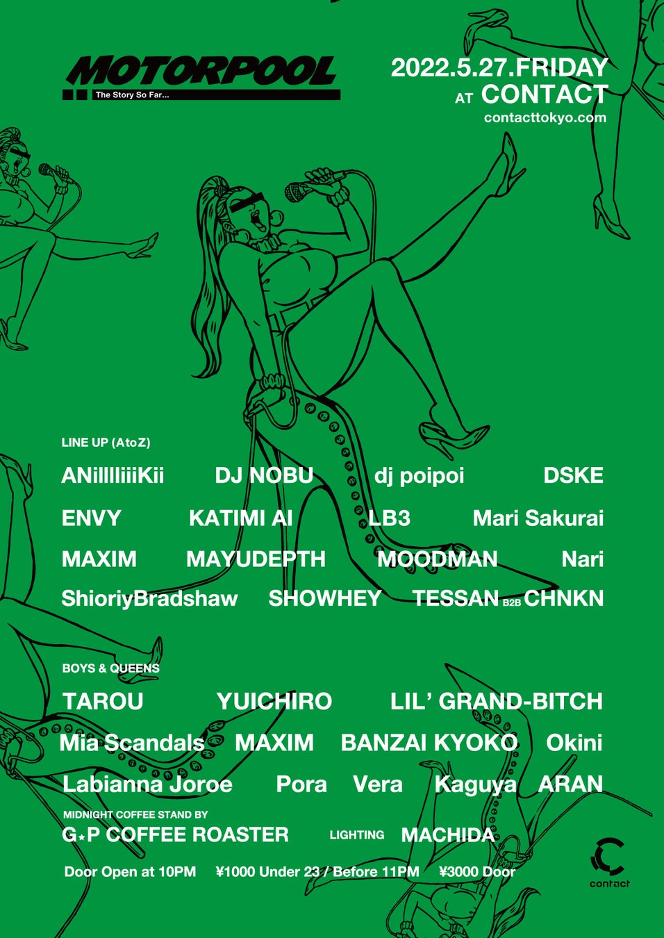 Contactとの2022年カウントダウンパーティを共催したMOTORPOOLが半年振りにカムバック!レジデントのDSKEとMAYUDEPTHによるキュレーションで多彩なエレクトロニックダンスミュージックの狂乱と楽園を描く。