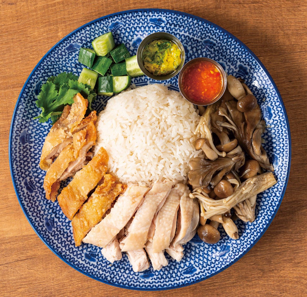 「きのこのダブルカオマンガイ」は、香り豊かに炒めた3種類のきのこ、しめじ・舞茸・えのきとサクッとした揚げ鶏・しっとり仕上げた茹で鶏をジャスミンライスと共に盛り付けました。タイの豆味噌"タオチオ"とニンニクの効いた、赤くスパイシーなソースと、生姜とネギのジンジャーソースで好みの食べ方を探りながらお召し上がりいただき、次はどうしようかとワクワクしながら食事の時間を過ごしていただける、今しか食べられない一皿です。