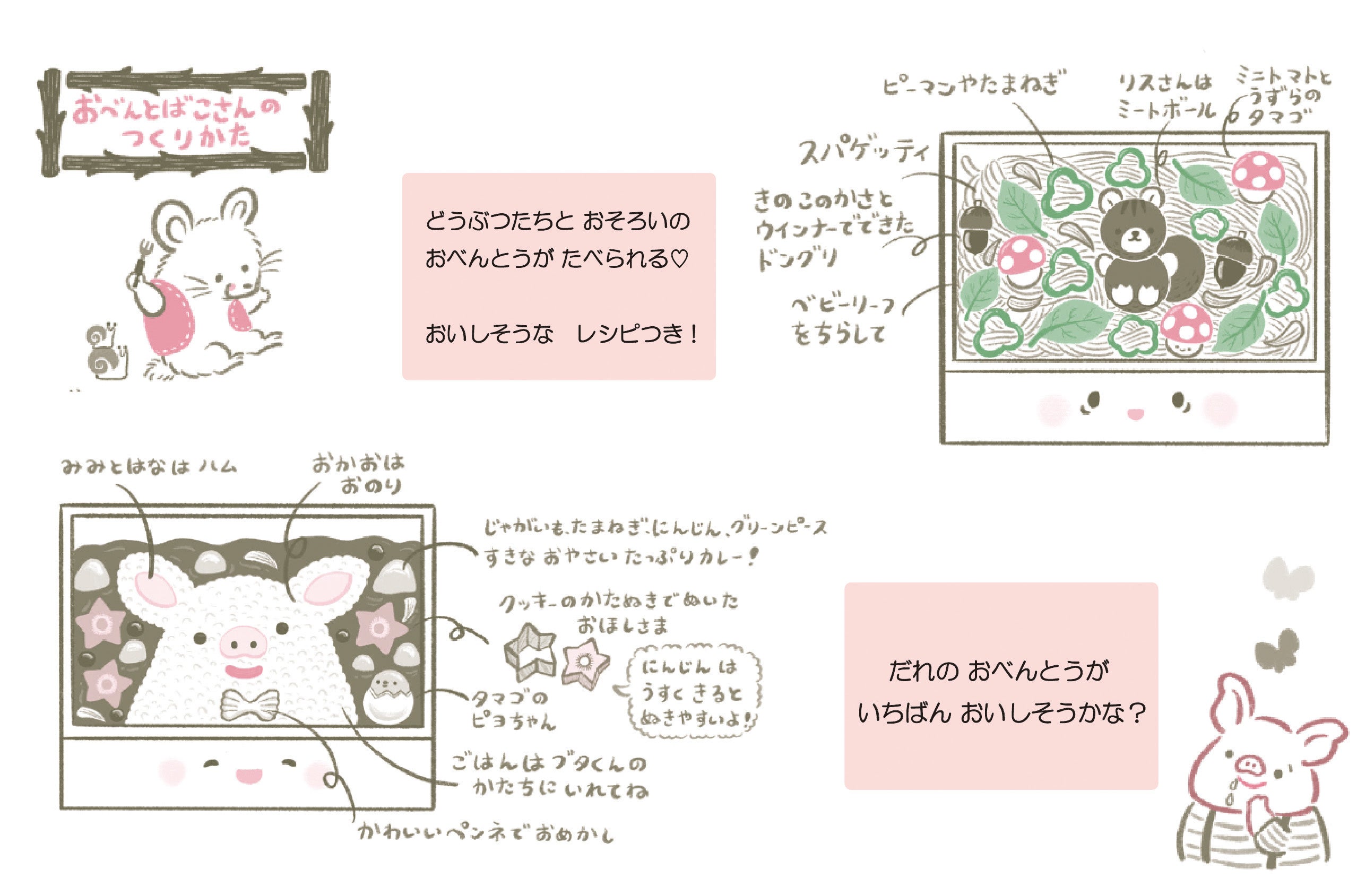 - かわいいおべんとう!このたべものは〇〇!と大興奮で楽しく読みました。色あいもイラストもとっっってもカワイイです。