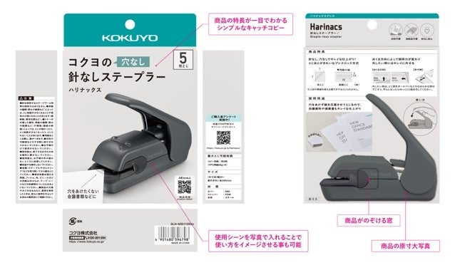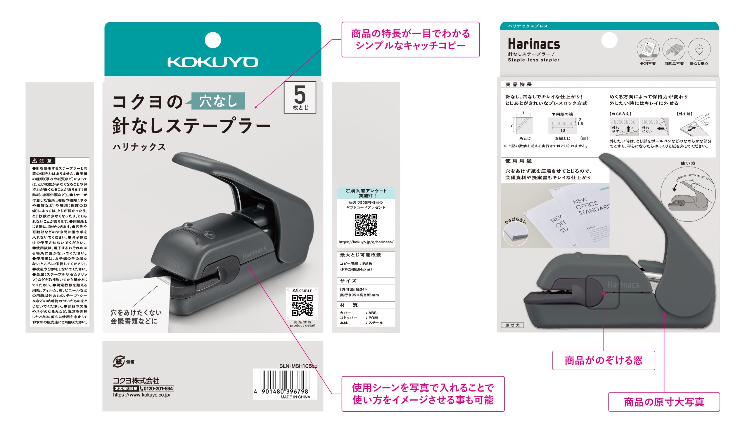 近年、市場全体が脱プラスチックのためのパッケージに切り替わる中、コクヨも段階的に紙パッケージの導入を進めています。一方で、手に触れて使うハサミやステープラーなどの金属文具は商品本体が見えて使い心地が想像しやすい透明なブリスターパックが主流となっています。その反面、ブリスターパックでできる限られた印刷表現の中で、様々な機能を持った文具の特徴を、多様なお客様にわかりやすく伝えることに課題を感じていました。