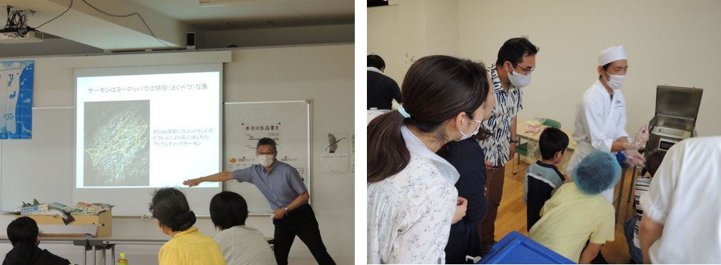 今回も感染防止のため、参加は個人ではなくグループ単位、8組までと設定。7月からの感染急拡大により、参加者が集まるかなど懸念もありましたが無事に枠は埋まり、リピーターも2組あったとのことで本イベントが地域にも定着していることが伺えました。残念ながら、当日に2組のキャンセルがあったため、最終的には6組24名の参加となりました。グループはすべて家族単位で、3世代での参加も。イベントは3部構成で、サケにまつわるお話、お寿司用サケ解体実演、およびお寿司握り体験と水族館バックヤードツアーを行いました。