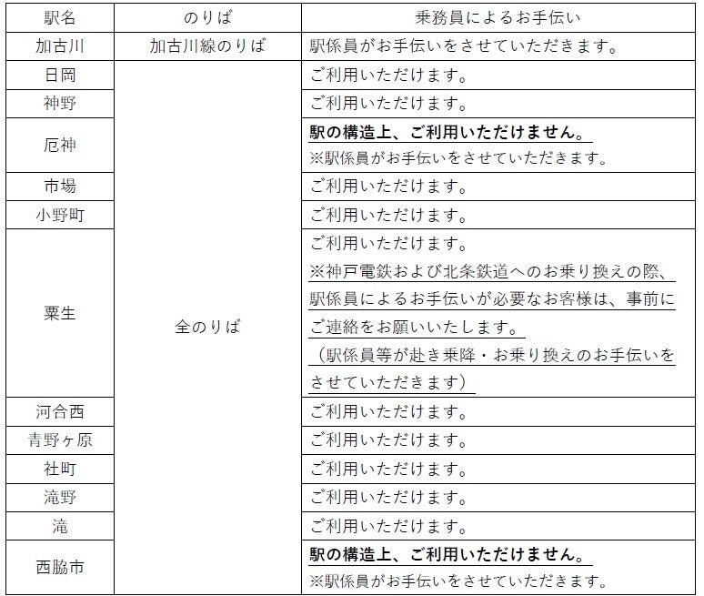 このたび、加古川線の対象駅においても、乗務員による車いすをご利用のお客様の乗降のお手伝いを開始しますのでお知らせします。