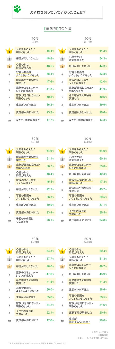 【LINEリサーチ】犬や猫を飼ってよかったことTOP2は「元気をもらえた/明るくなった」「心穏やかな時間が増えた」