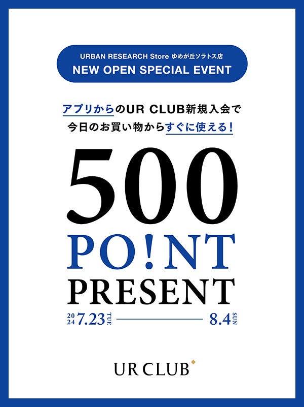 7月23日(火)~8月4日(日)の期間中、アプリからUR CLUBに新規入会いただいた方へ、今日のお買い物からすぐにお使いいただける500ptをプレゼントいたします。