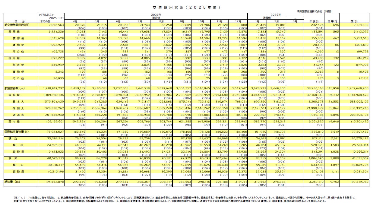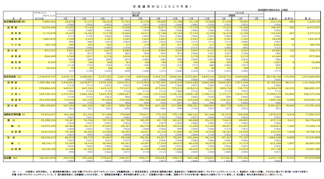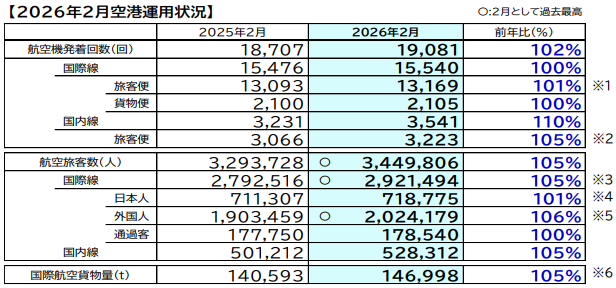 2026年2月 空港運用状況 国際線旅客数、外国人旅客数共に2月として過去最高に