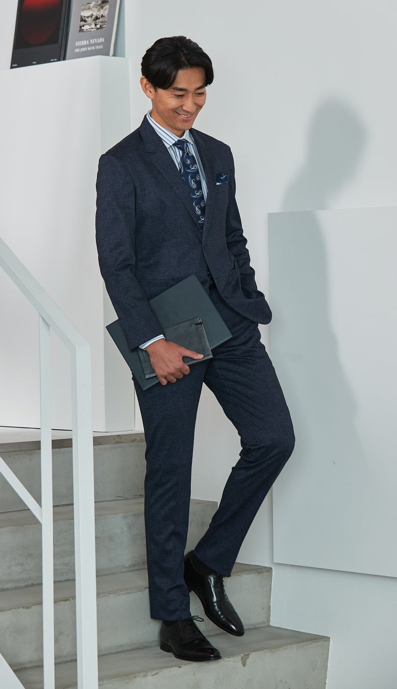 ビジネススタイルのカジュアル化が一般的となり、スーツ市場においてもカジュアルライクな素材が増えております。中でも、デニム調生地は他のアイテムとも相性がよく、抵抗感なくビジカジスタイルに取り入れることができる万能アイテムです。