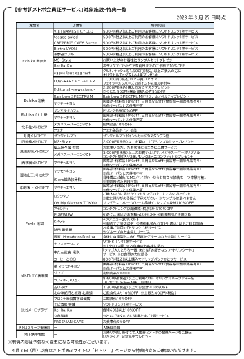 本リリースの「【参考】「メトポ会員証サービス」対象施設・特典一覧」または4月3日(月)以降にメト