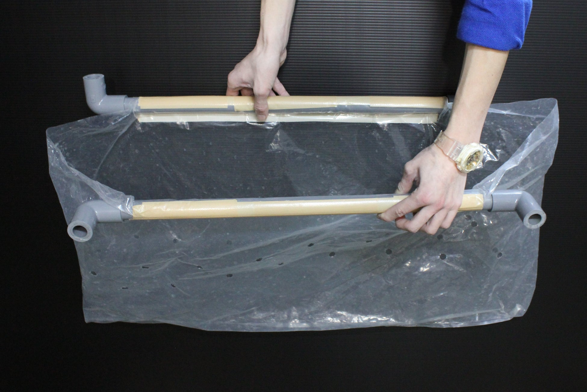 サンシャイン水族館では生物の取り上げなどで欠かせないアイテムであるビニール製の道具(通称:ビニダモ)を、タチウオの長細い体に合わせて作製。