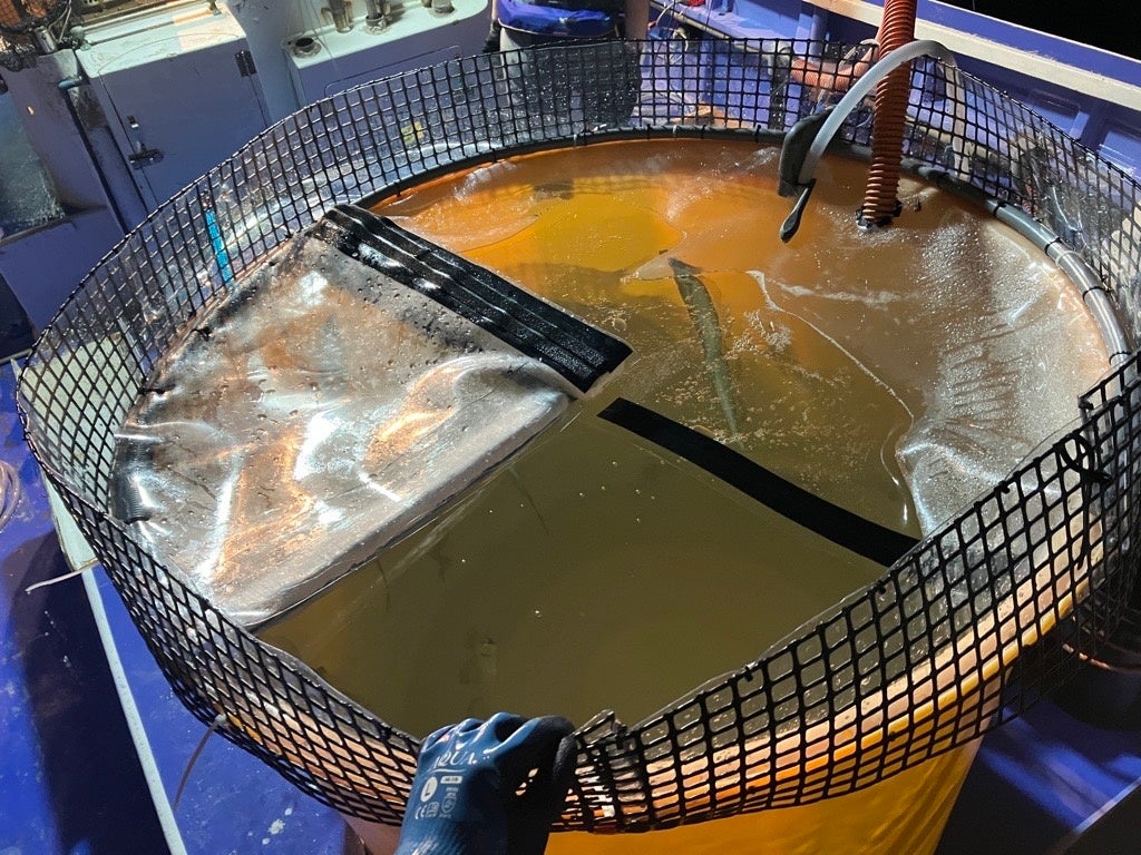 活魚車の水槽からタチウオをビニダモですくい、エレベーターで水族館のある屋上まで運搬します。