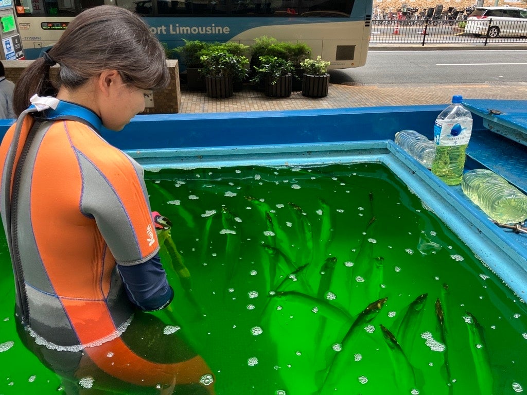 輸送中は、釣り上げた際に負った傷の炎症を防止するために薬剤を投入し薬浴をします。また活魚車の水槽は車の揺れによる水の跳ね返りを防ぐためできるだけ水をいっぱいにし、車道は溝のないレーンや段差の少ない道を選び細心の注意を払って輸送します。