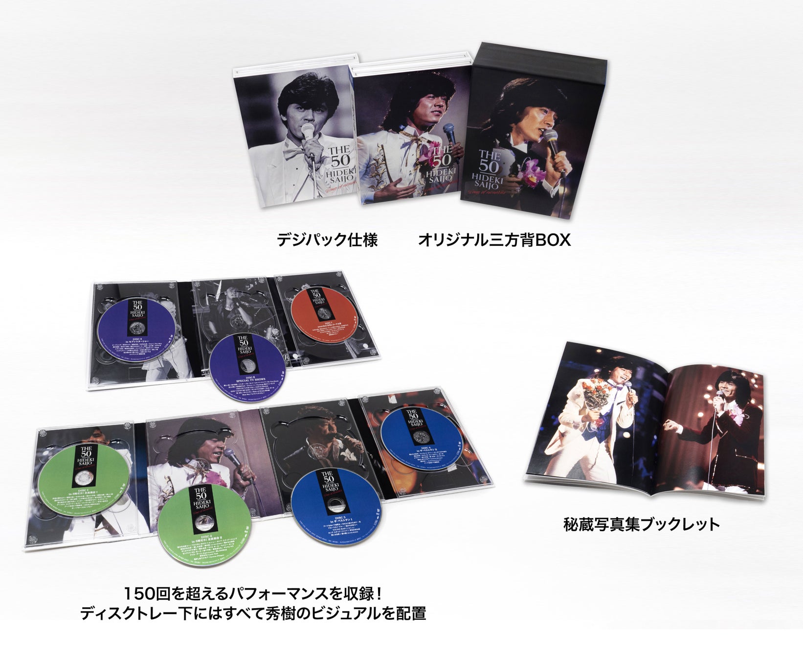 2021年、デビュー50周年目に突入した西城秀樹、数々の貴重な映像が遂にDVD-BOX『THE 50 HIDEKI SAIJO song of memories』として西城秀樹デビュー50周年日である2022年3月25日に発売決定。7枚組からなるこのDVD-BOXは、西城秀樹のTBSでの出演集であり、今も尚、鮮烈な記憶としてファンのみならずとも脳裏に焼き付いている『YOUNG MAN(Y.M.C.A.)』で番組史上唯一の"最高得点9999点"を叩き出した「ザ・ベストテン」をはじめ、体操などでも活躍した「8時だよ!全員集合」の歌唱シーン、1976年の阿久悠企画・久世光彦プロデュースによる90分のワンマンショー「セブンスターショー」、極上の音楽を発信し続けた「サウンド・インS」他、各音楽バラエティ、数々の受賞歴を誇る「日本レコード大賞」など、これまでに西城秀樹がTBSに残してきた足跡を辿ることができる貴重な映像集となっている。