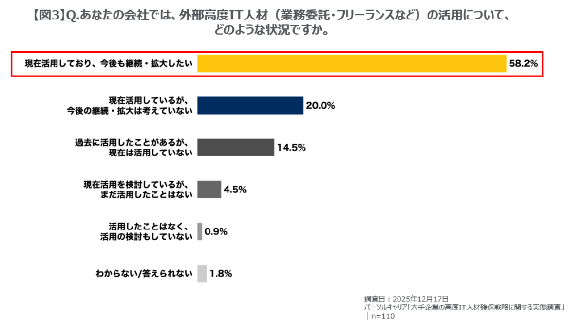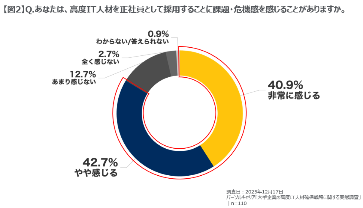 転職サービス「doda(デューダ)」などを運営するパーソルキャリア株式会社(本社:東京都港区、代表取締役社長:瀬野尾 裕、以下パーソルキャリア)は、2025年12月、従業員数1,000人以上の企業で採用戦略立案・採用活動・受け入れに関与する課長職以上の110人を対象に、「高度IT人材※1確保戦略」に関する実態調査※2を行いましたので、結果をお知らせします。