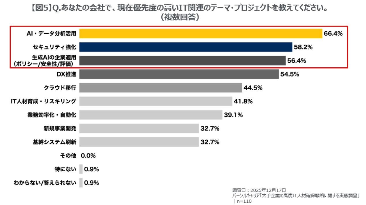 〜「外部人材の活用」は、採用難易度が高まる中での有効な選択肢に。優先テーマトップ3は「AI・データ分析活用」「セキュリティ強化」「生成AIの企業適用」~