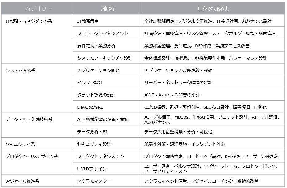 ※1 本調査では、IT戦略・マネジメント系、システム開発系、データ・AI・先端技術系、セキュリティ系、プロダクト・UXデザイン系、アジャイル推進系などにおいて、高度な職能(スキル・能力)を持ち、独力で業務遂行可能な専門性の高いIT領域を担う人材を指します。