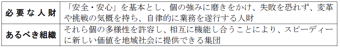 「安全・安心」という価値観を守りつつ、ポストコロナ社会に適応した抜本的な事業構造変革を成し遂げるため、「必要な人財」と「あるべき組織」を制定しています。