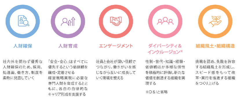 上記「必要な人財」の確保と「あるべき組織」の実現に向けて、「人財戦略」として下記の5つの項目を推進しています。