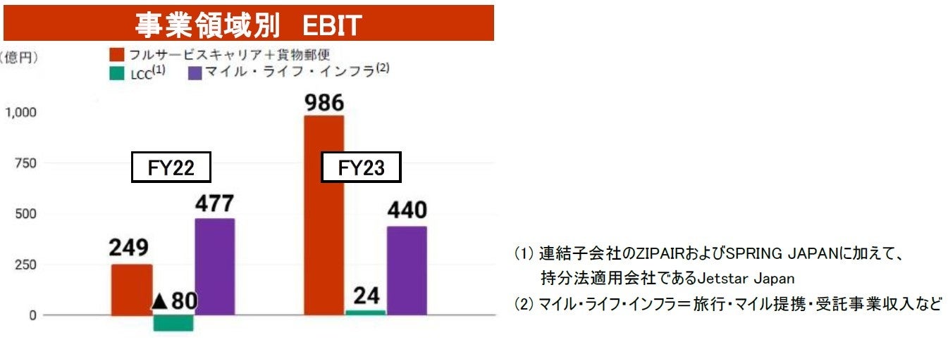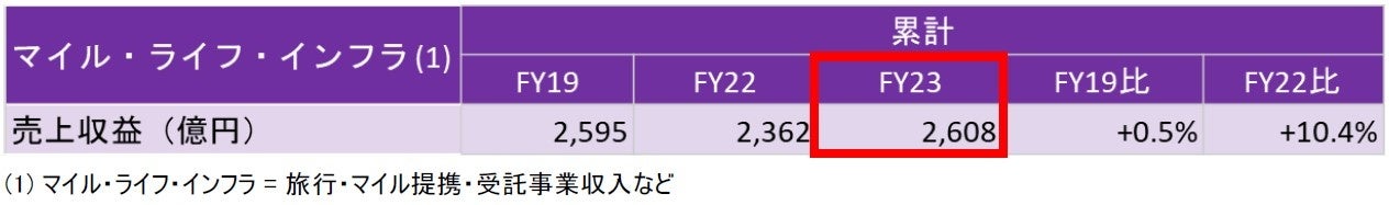 JALUXの収入増や外航グランドハンドリング受託便数増などにより、売上収益は前年比約10%増となりました。マイルの発行数は順調に増えており、マイル・ライフ・インフラ事業領域は安定的に利益を計上しております。今後は更に利益を伸ばすべく努力してまいります。