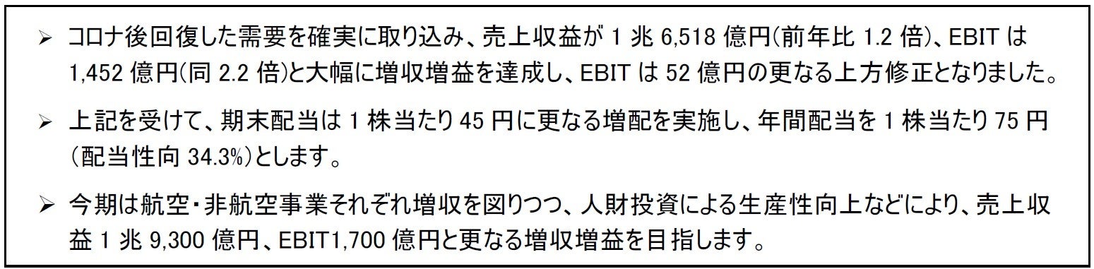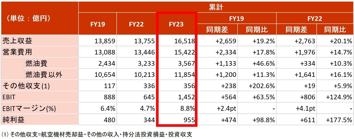 復便による供給量の増加に加え、円安や世界的なインフレの進行、安定的な人財確保に向けた人的資本投資により費用は約15%増加したものの、コスト抑制努力やイールド向上により収益性向上に努めた結果、売上収益は約20%増加し、当期はEBIT、純利益共に前年度を大幅に上回りました。