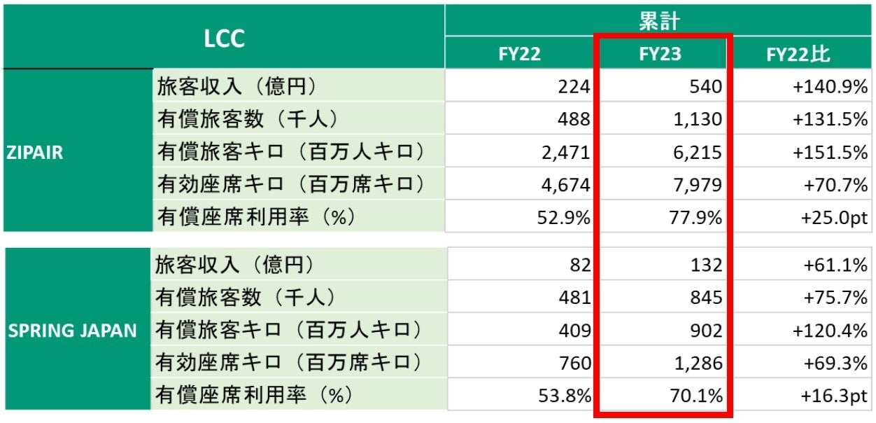 FY23はEBITが黒字となりました。ZIPAIRは、2024年3月からバンクーバー線に新規就航し、就航地点は