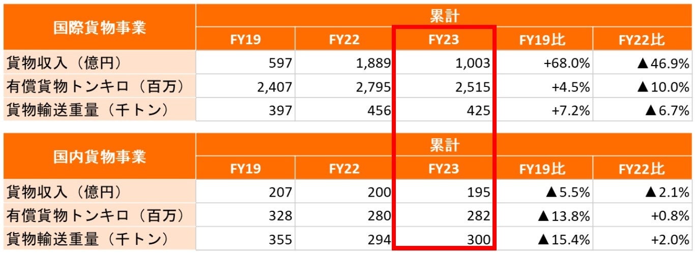 国際貨物事業ではコロナ禍の収束とともに航空貨物需要が減退傾向にあるものの、引き続き旺盛なEC需要を取り込むとともに高付加価値貨物を中心に物量の最大化を図り、FY19年対比では輸送重量は約7%増、収入は約1.7倍となりました。