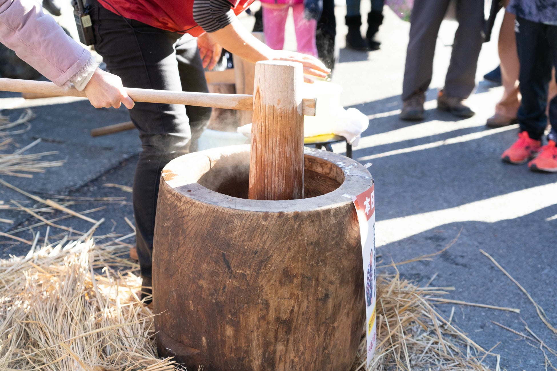 玉川温泉は「昭和レトロ」がコンセプト。昭和の時代が懐かしい世代にも、また昭和の知らない世代にも、昭和の魅力を発信したいという想いから、さまざまなイベントを開催いたします。お正月定番の餅つきは、玉川温泉の食堂で使用している「里山ぐるぐるスマイル農園」さんから仕入れた「古代米」を使用。杵と臼でお客さまと一緒にお餅をつき、でき立てのお餅を無料配布します。