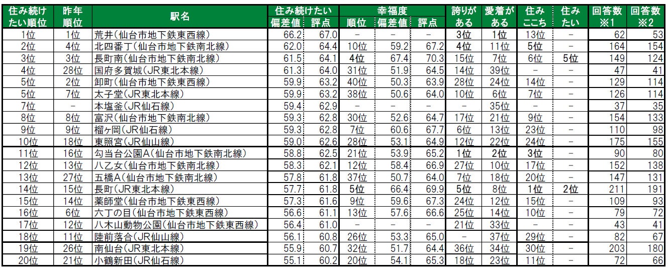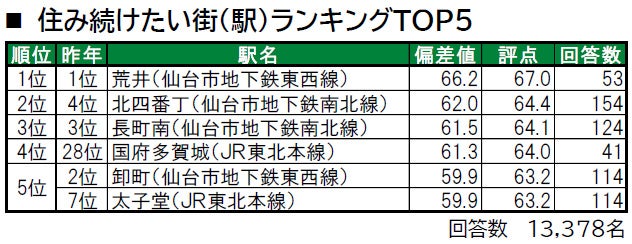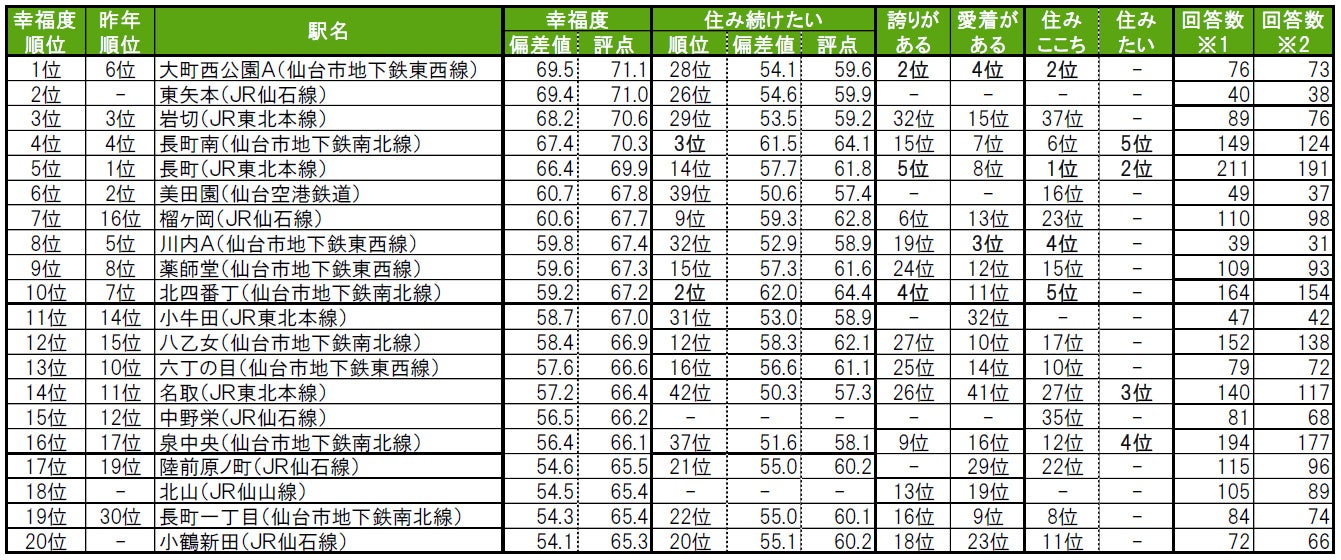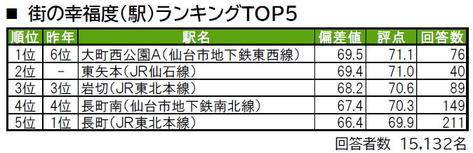1位は2年連続で仙台市若林区に位置する荒井で、「街に愛着がある」でも1位、「街に誇りがある」3位となっています。2位は仙台市青葉区に位置する北四番丁で、「街に誇りがある」4位、「住みここち」5位の駅です。3位は2年連続で仙台市太白区に位置する長町南で、「街の幸福度」4位、「住みたい街」5位となっています。