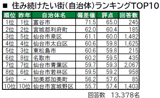 1位は、2年連続で富谷市です。富谷市は、「住みここち」「住み続けたい街」「街に誇りがある」「街に愛着がある」でも1位と各ランキングで高い評価を得ています。2位は名取市で、「住みたい街」では4位となっています。3位は、遠田郡美里町です。
