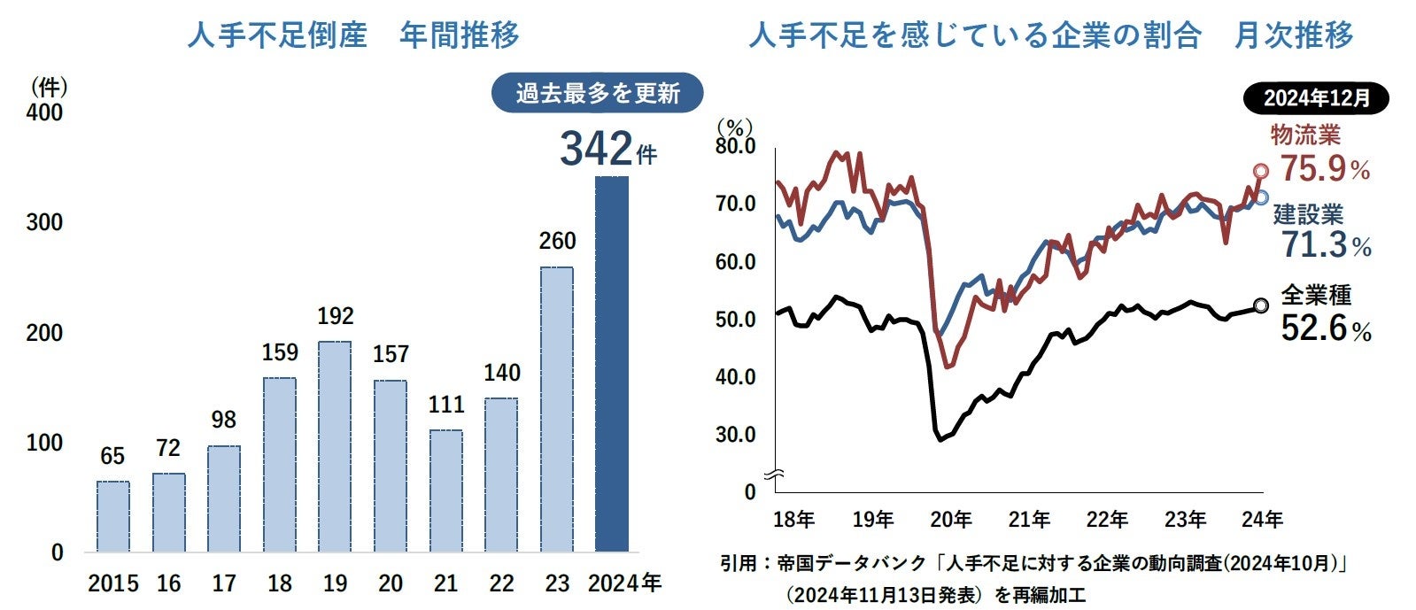 人手不足倒産は過去最多を更新、2年連続の大幅増 前年比1.3倍の342件、建設・物流業が全体の約4割